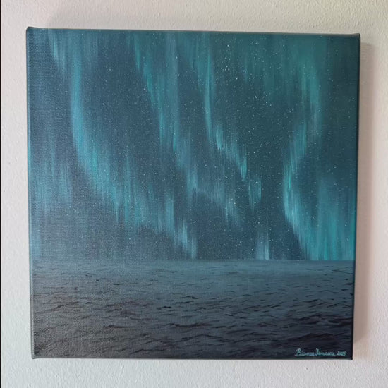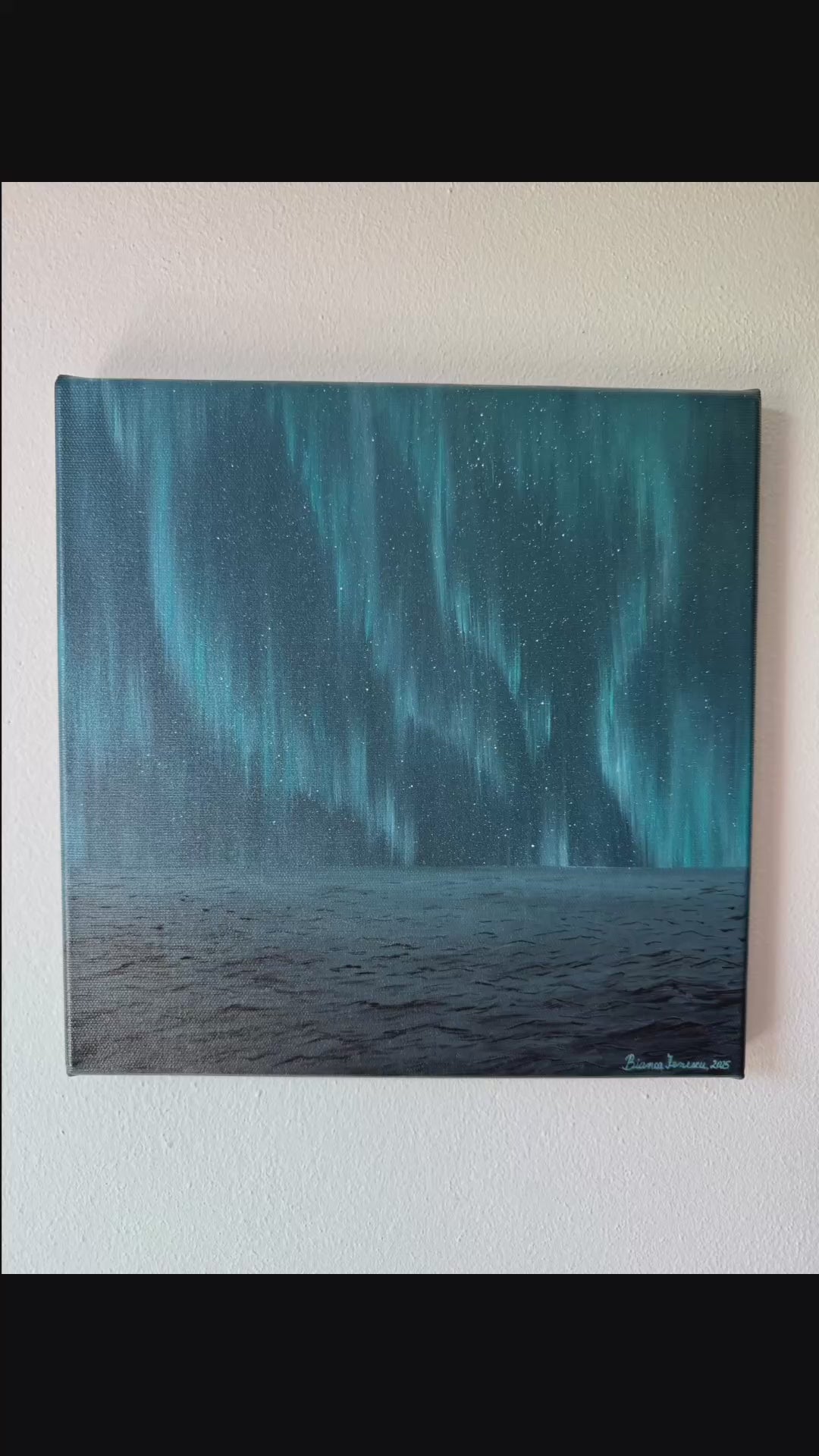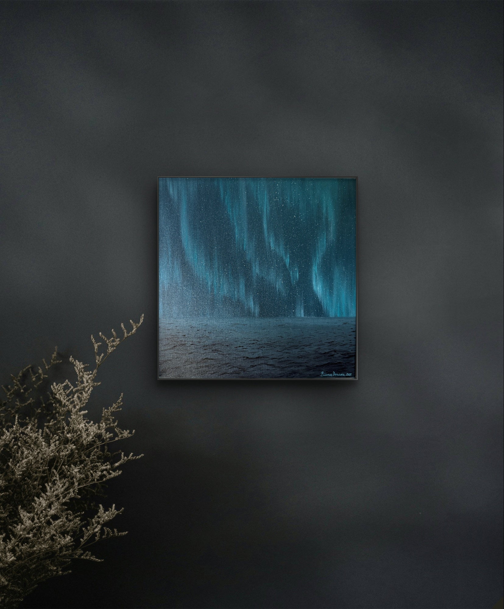 This painting reflects my fascination with the northern lights, showing the ocean beneath their magical glow, something I have yet to see in person...