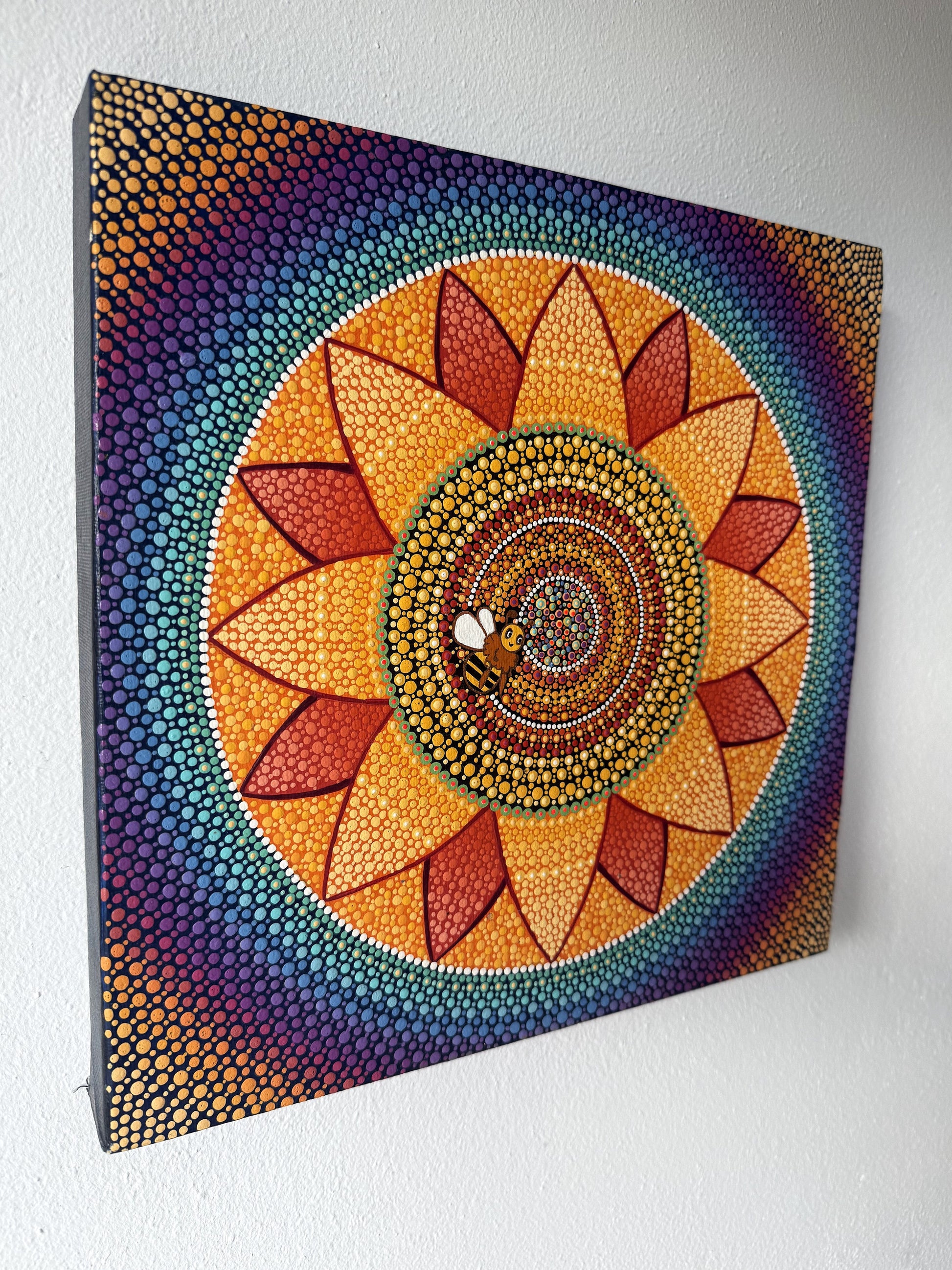 This artwork captures a cheerful, round bumblebee amidst a burst of color, reminding us to embrace life’s simple joys. With its vibrant colors and whimsical vibe, this painting is a tribute to the small wonders of nature that often go unnoticed.