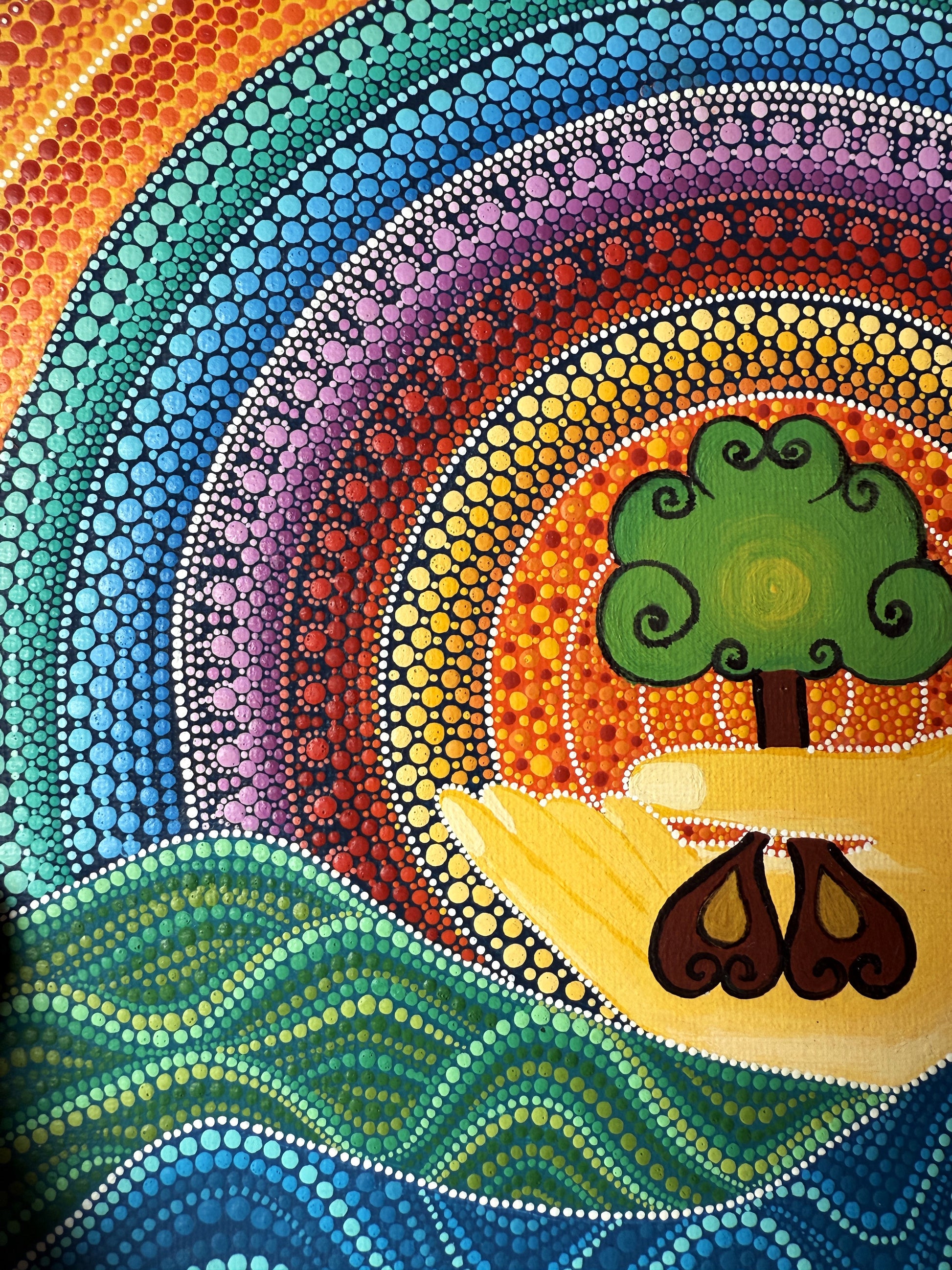 I painted this to honor the fragility of life and how care begins in the smallest gestures. A tree held like a promise, in a sky of living color.