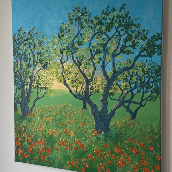 This painting came from a deep longing for color, warmth, and life. I wanted to capture that feeling of walking through a spring garden. I used imitation gold leaf to bring in a sense of magic, like nature itself is glowing...